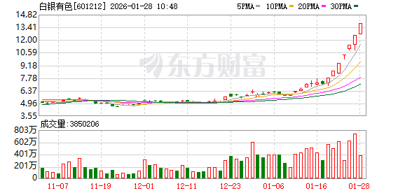 白银有色(维权)盘中涨停,已连收7个涨停板,截至10:04,该股报13.81元,换手率4.84%,成交量3.59亿股,成交金额48.16亿元,涨停板封单金额为9209.34万元。连续涨停期间,该股累计上涨95.06%,累计换手率为50.23%。最新A股总市值达1022.60亿元。