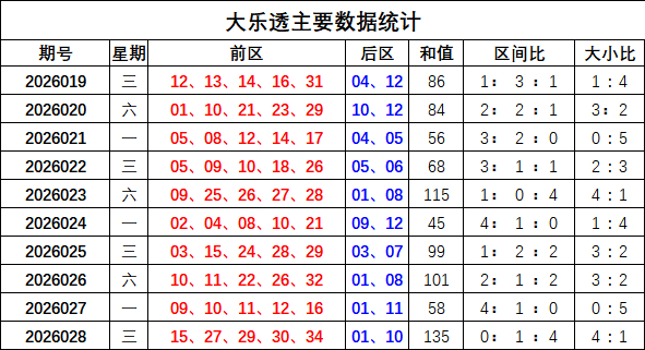 上期追溯:大乐透上期奖号为:前区15 27 29 30 34,后区01 10,前区奖号和值为135,区间比0:1:4,大小比为4:1,