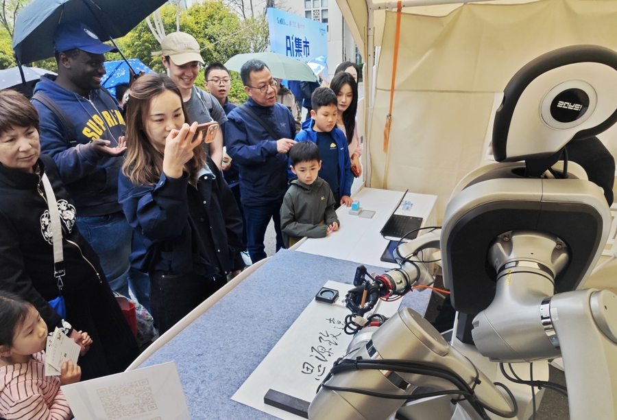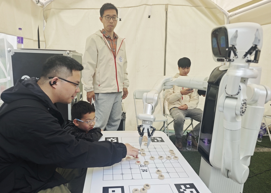 上海交通大学AI集市上,市民在与机器东谈主对弈 影相:陶磊