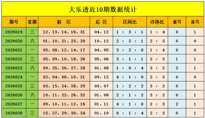 上期回来:大乐透第2026028期奖号为:前区15、27、29、30、34,后区01、10,前区奖号三区比为0:1:4,冷热比为2:3,后区开出小大组合01、10