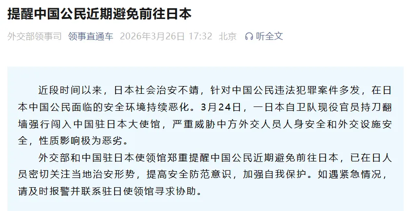 近段时辰以来,日本社会纪律不靖,针对中国公民犯罪犯罪案件多发,在日本中国公民濒临的安全环境合手续恶化。3月24日,一日本自保队现役官员合手刀翻墙强行闯入中国驻日本大使馆,严重恫吓中方酬酢东谈主员东谈主身安全和酬酢才气安全,性质影响极为恶劣。